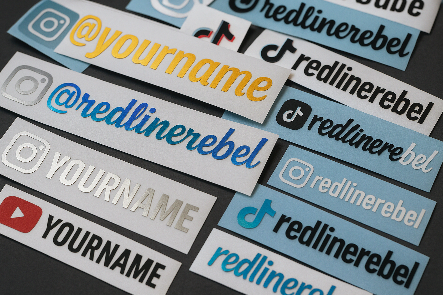 Custom social tags for your ride – Instagram, TikTok, YouTube & more.